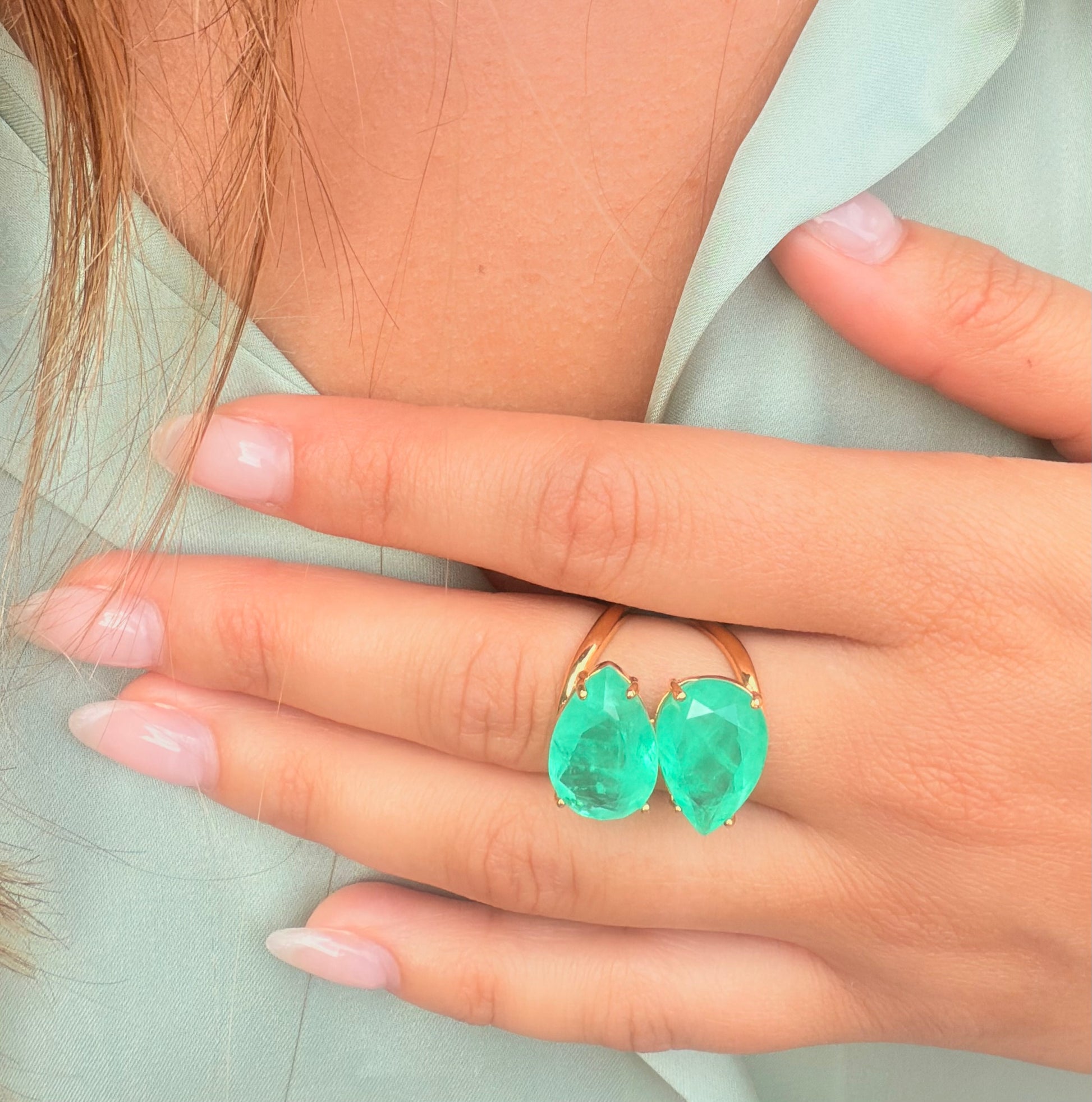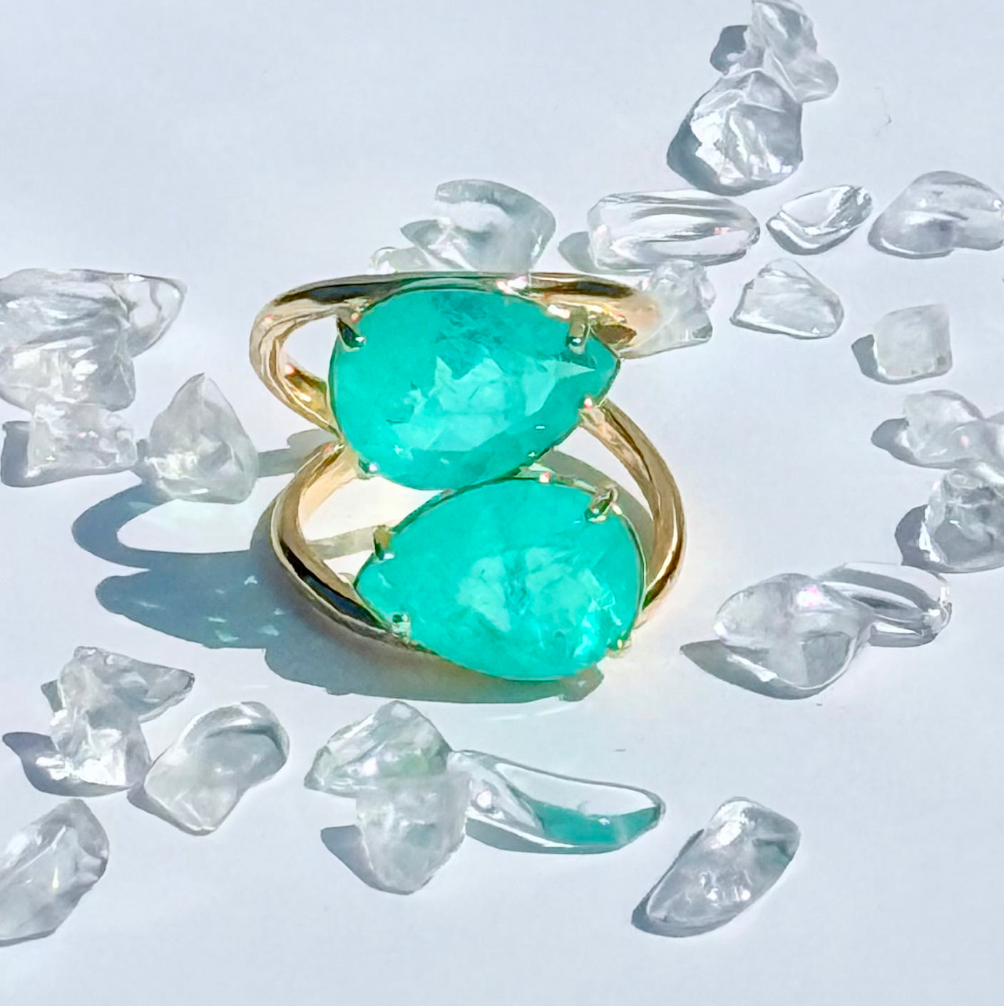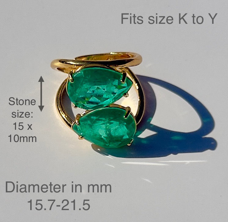 Bonita presents this delicate balance of strength and grace, this ring is a luminous expression of your inner power. Featuring two faceted Green Quartz gemstones set in a modern open silhouette, this adjustable piece wraps the finger in an elegant embrace.