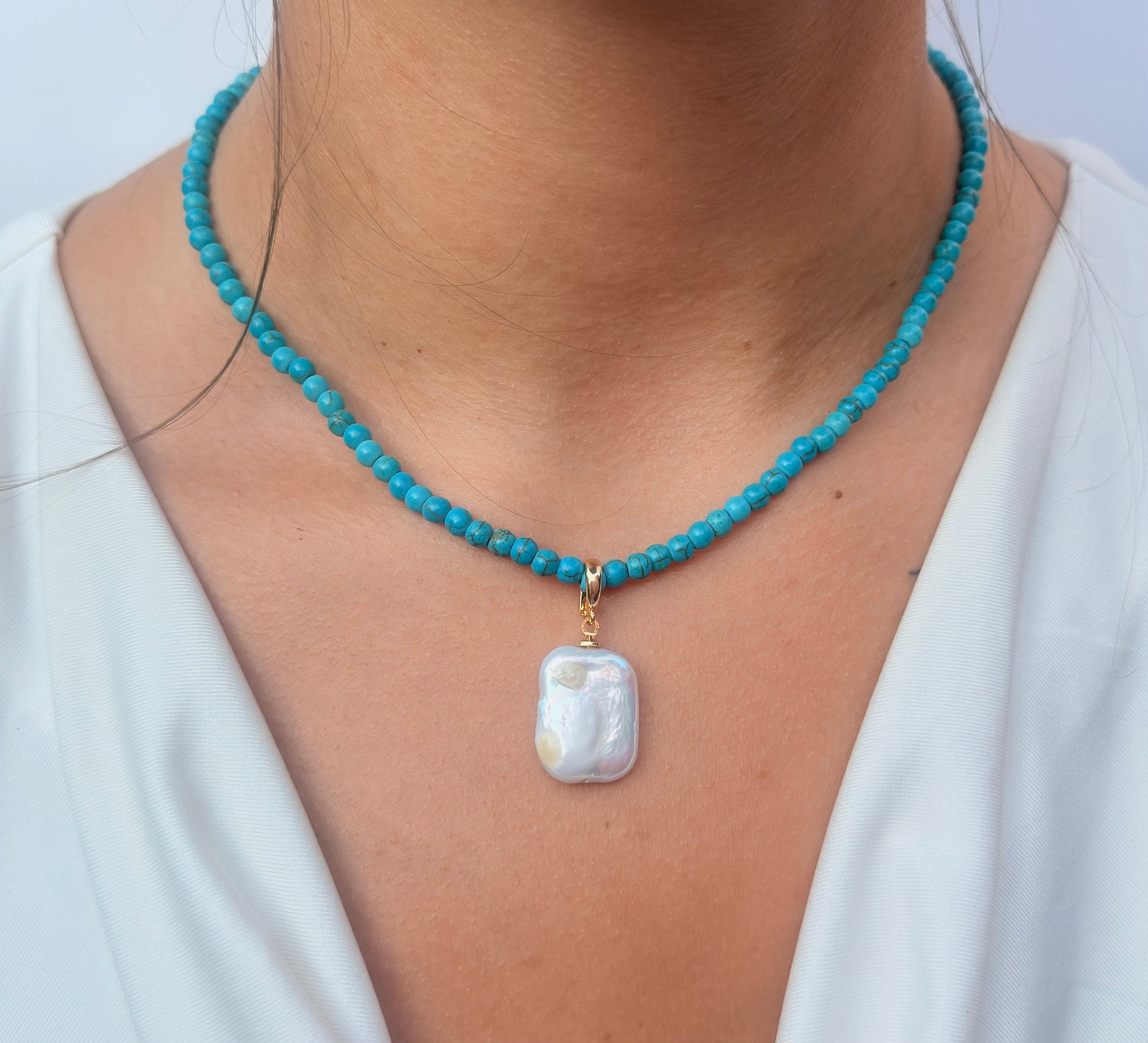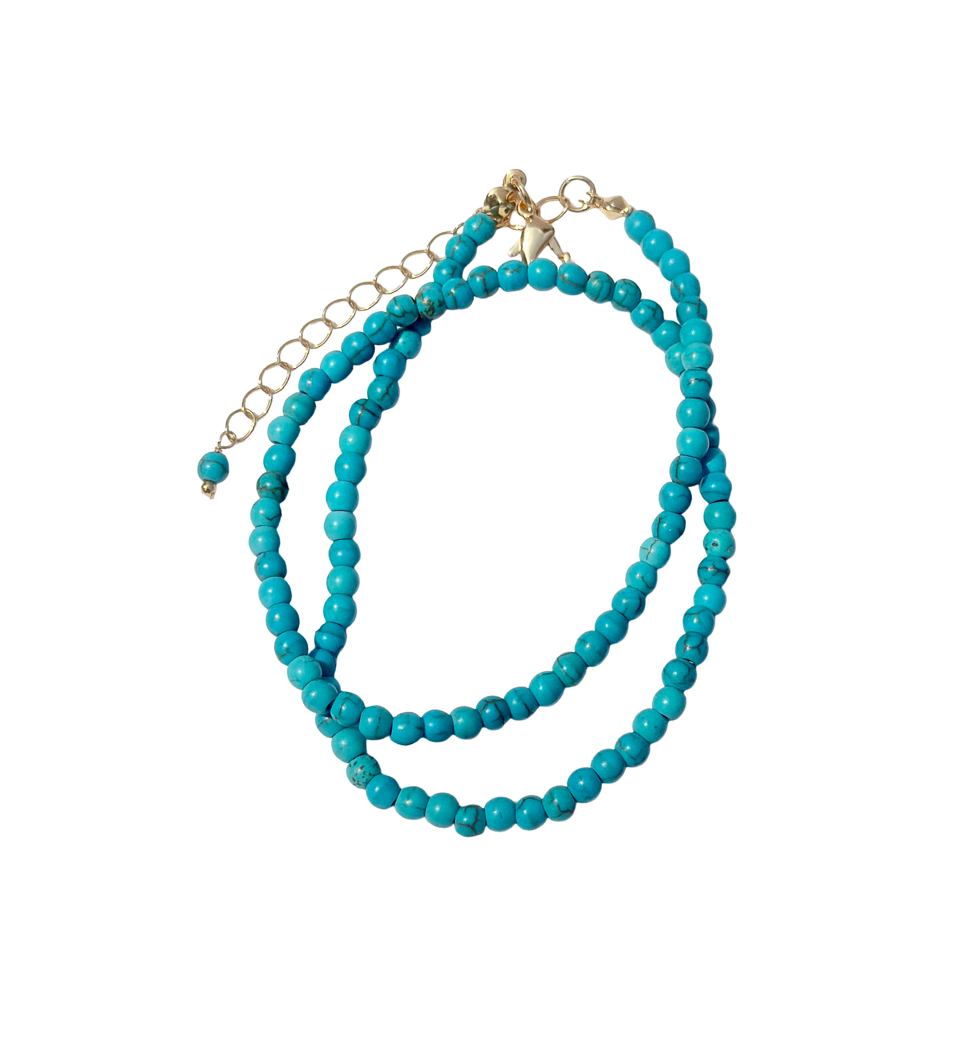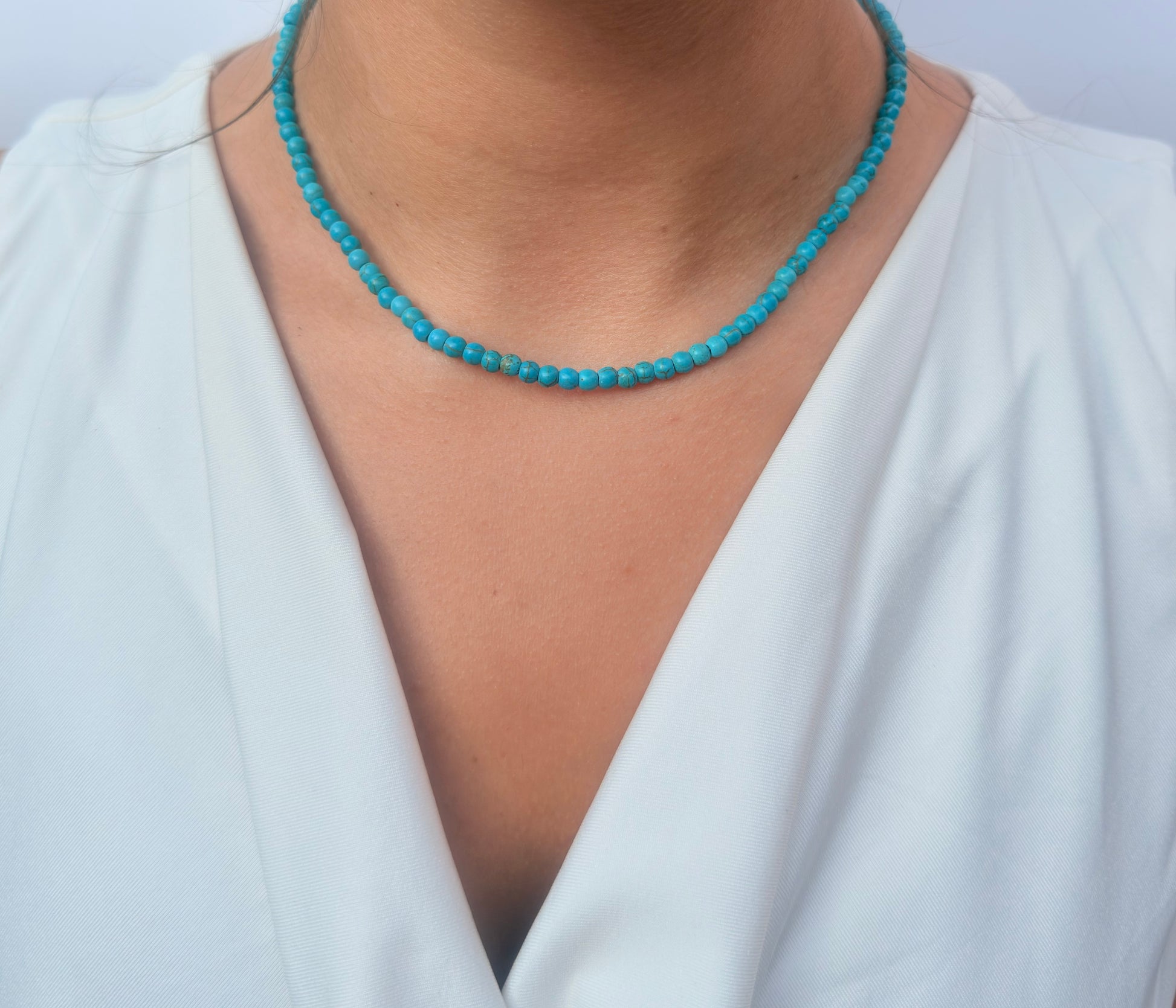 There are pieces that catch the eye and then there are those that speak to the soul. This delicate necklace, strung with natural Turquoise beads, captures that elegance in its purest form. Each stone is a whisper of sky and sea, evoking open landscapes, distant horizons and the calm that lives at the heart of all beautiful things.