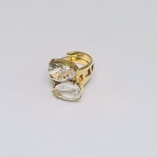 This adjustable ring pairs two luminous clear crystals in a bold vertical setting, representing harmony and dual strength. sculpted in a 18k gold plated base, the twin stones rest delicately atop a split band with openwork detailing - a design that balances elegance with every day empowerment.