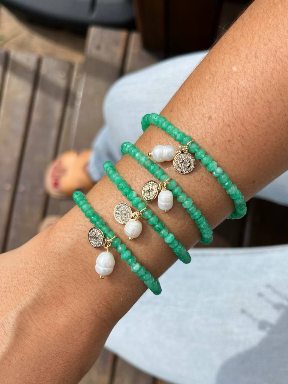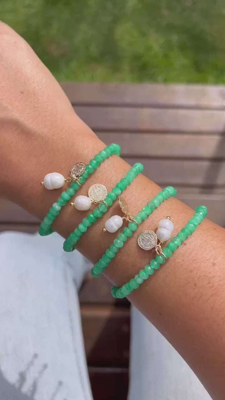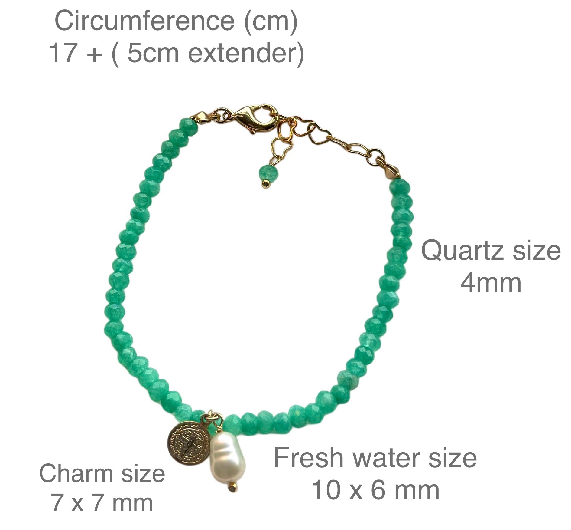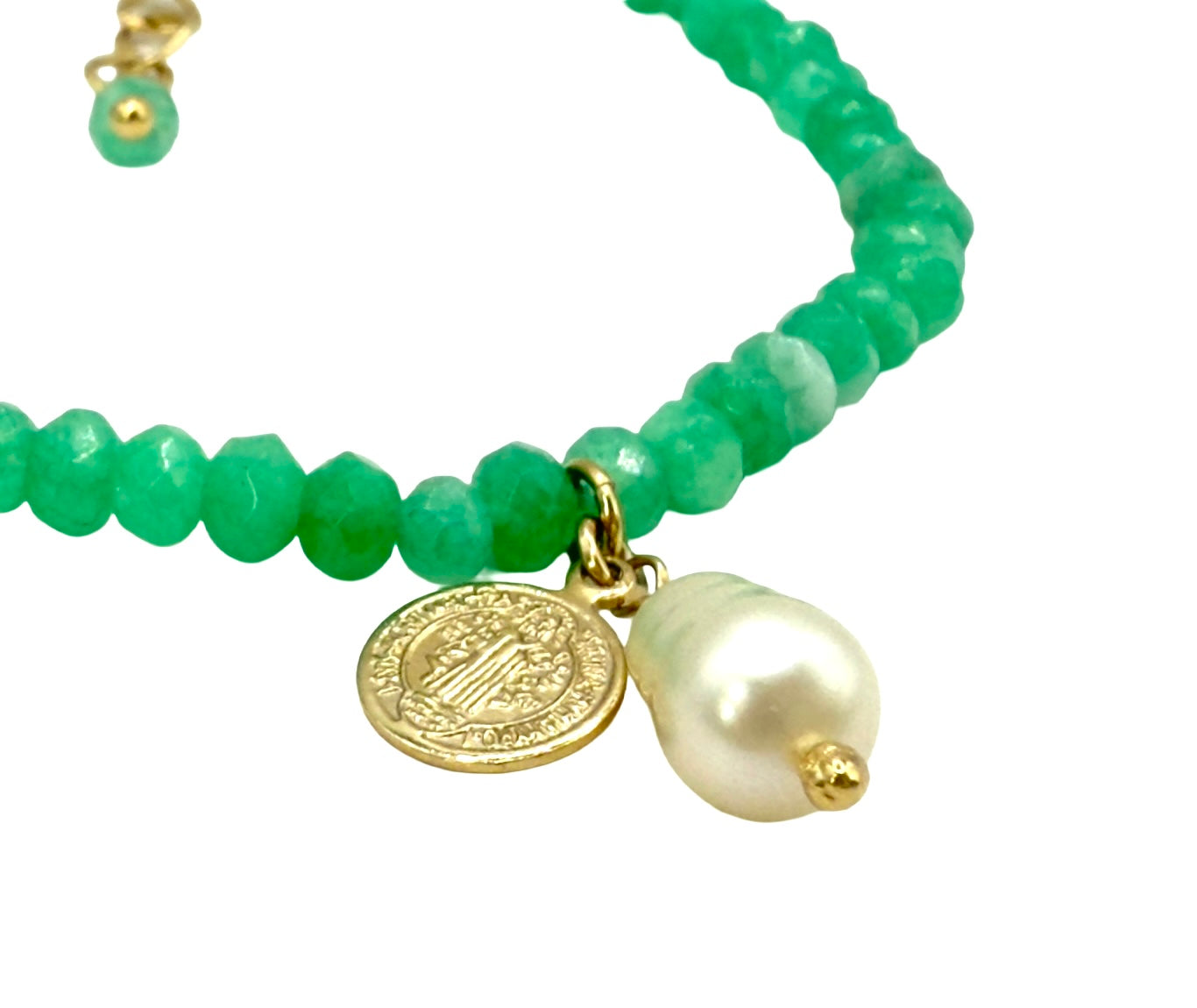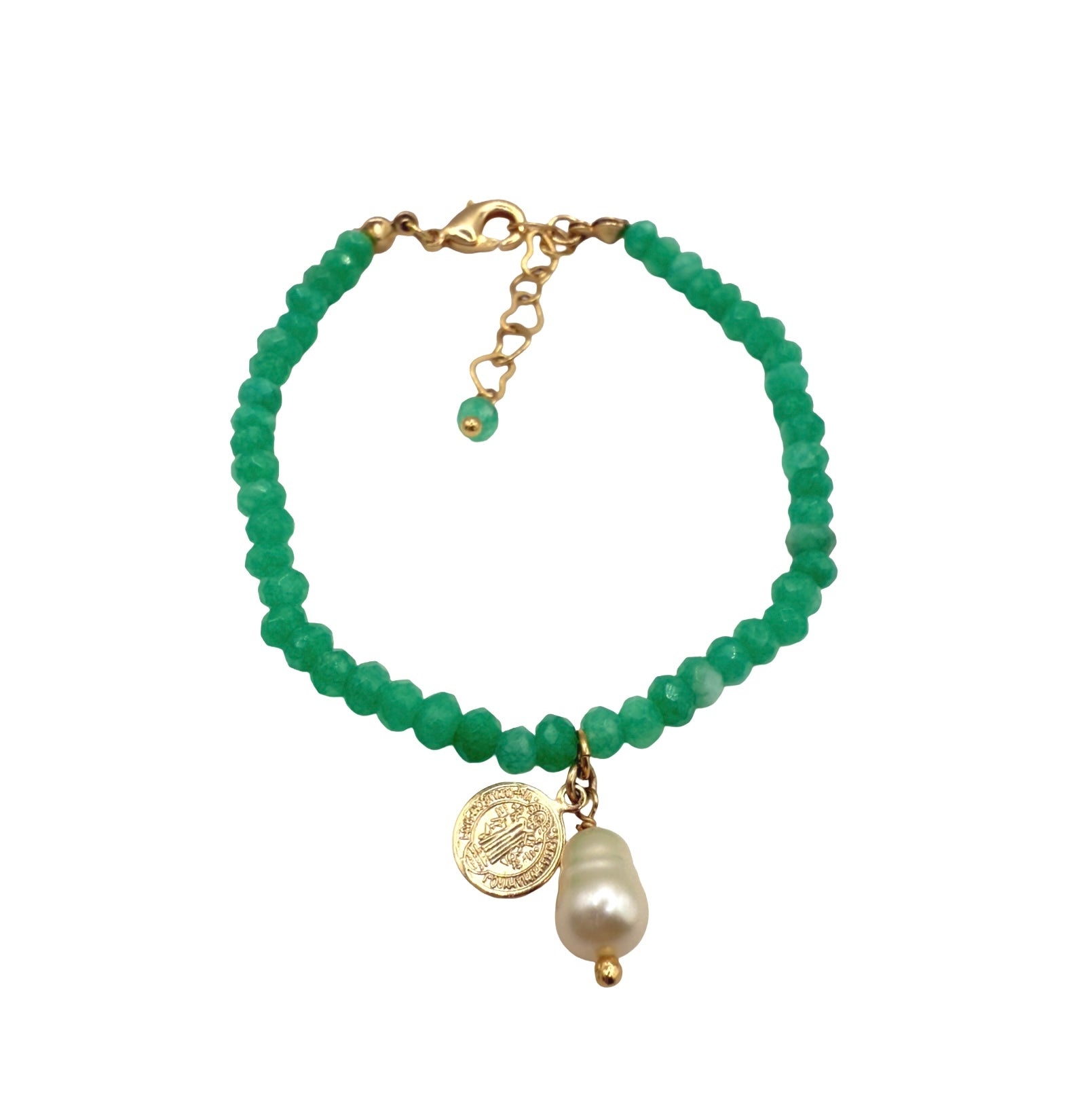 Bonita presents this elegant bracelet handcrafted with faceted natural green gem that shimmer gently with each movement. Cantered with a luminous freshwater baroque pearl, it is a reminder of life’s organic beauty and the power of embracing imperfection that is where beauty lies. A delicate 18k gold-plated charm adds warmth and light, while the gold-plated clasp and extender chain ensure both durability and comfort.
