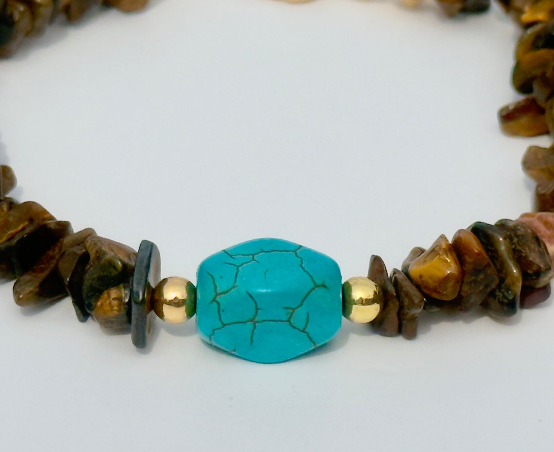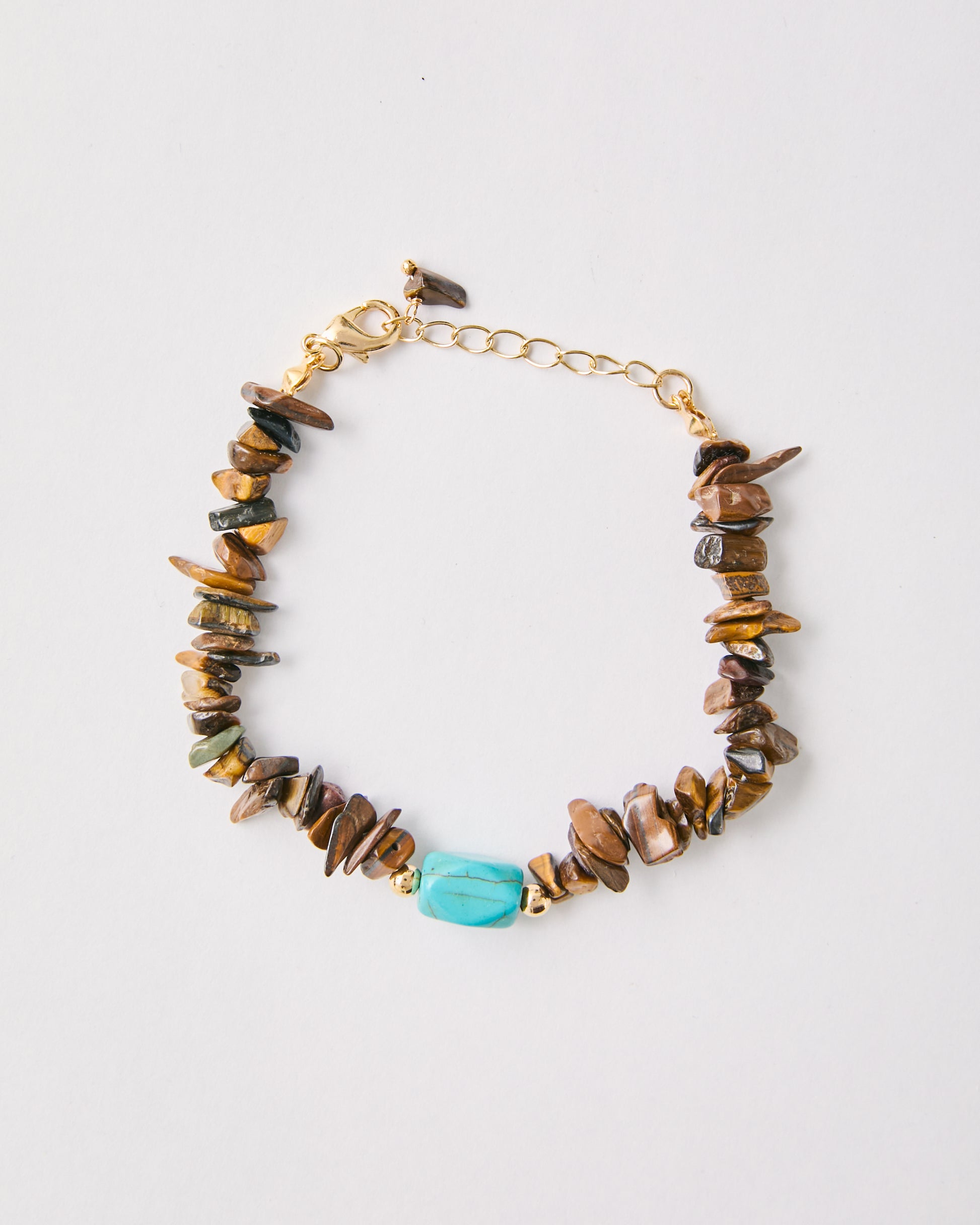 Bonita celebrates intentional style and meaningful craftsmanship with this genuine Tiger’s eye chips with a bold natural turquoise stone. Each piece is uniquely assembled adding exclusivity and charm to your personal story.
