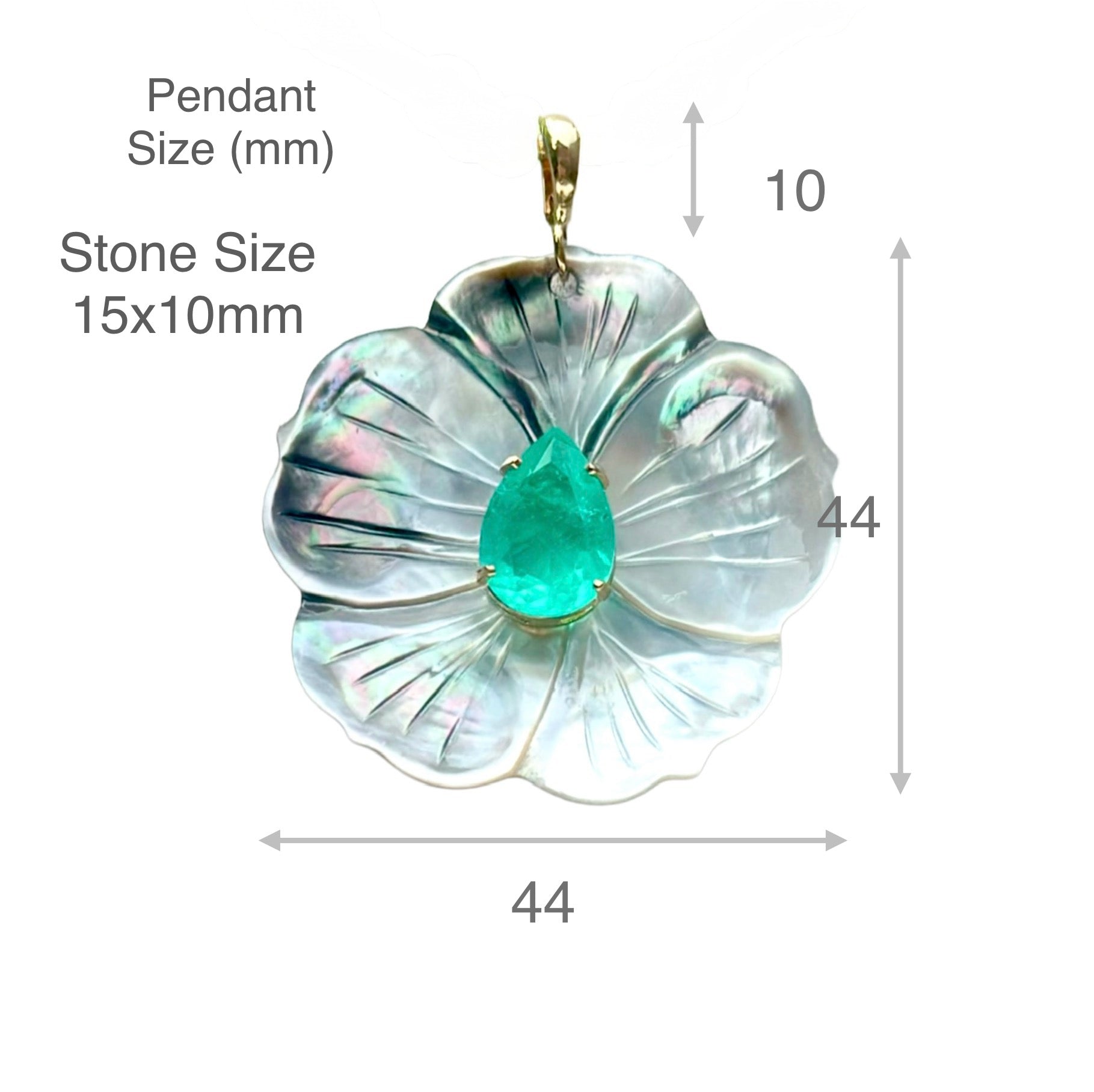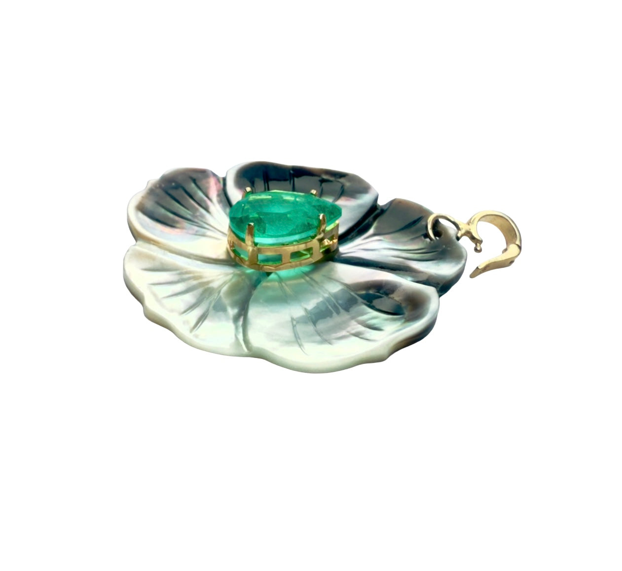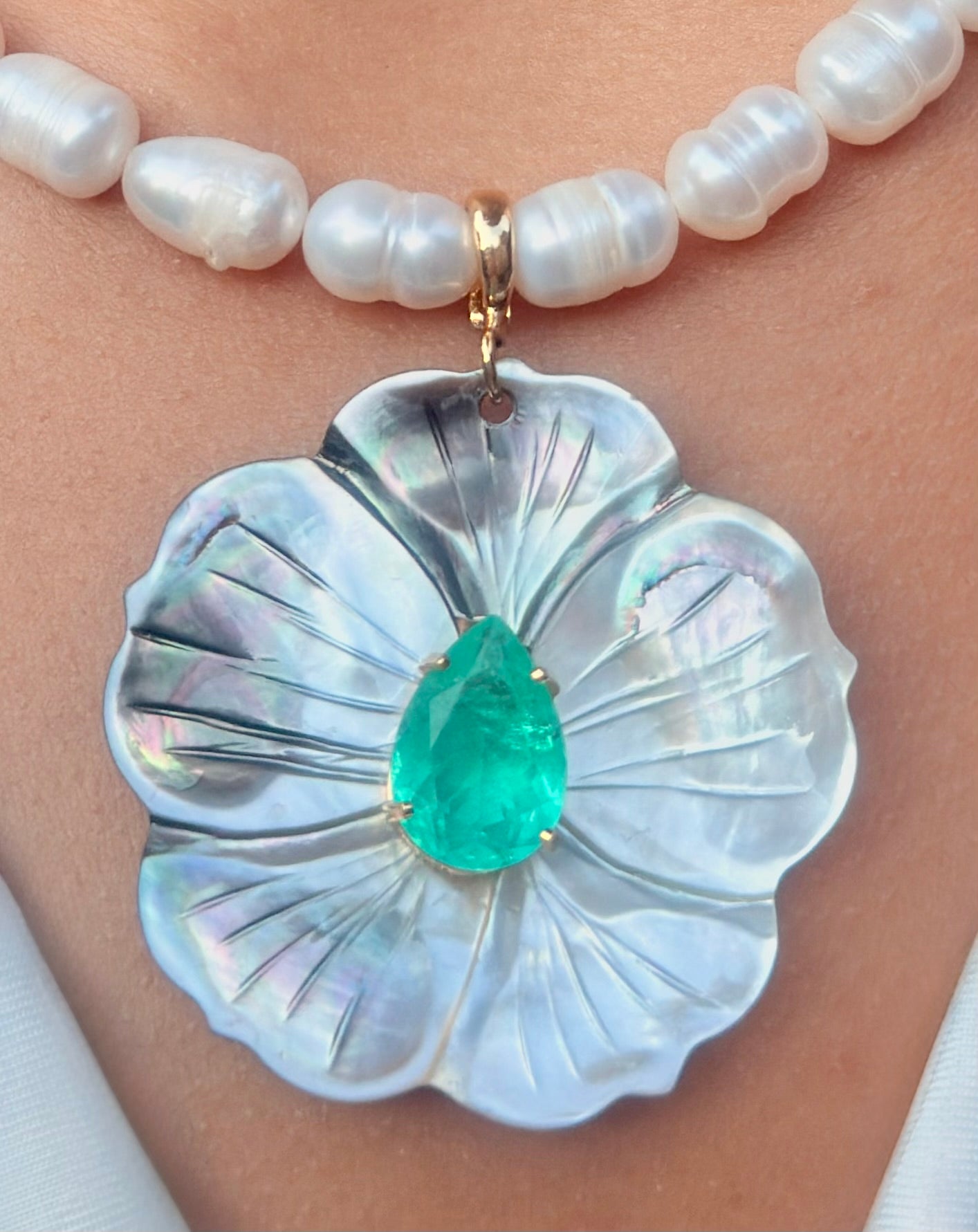 Bonita is proud to present this delicate yet powerful, the Flower pendant is a celebration of transformation - a floral symphony carved in luminous mother-of-pearl and crowned with a radiant green quartz. Suspended in timeless elegance, it serves as both adornment and affirmation: a symbol of the strength you carry and beauty that emerges through growth.