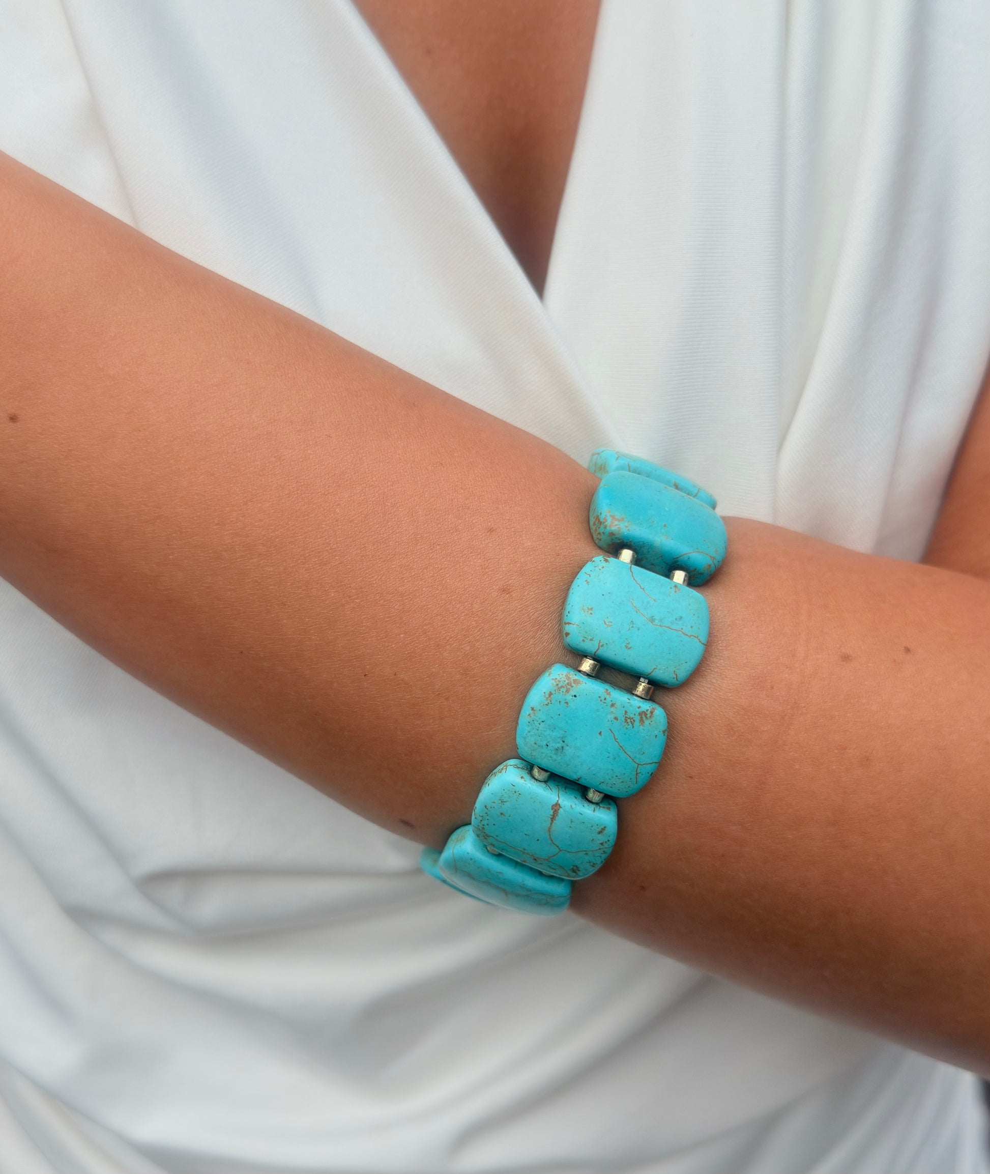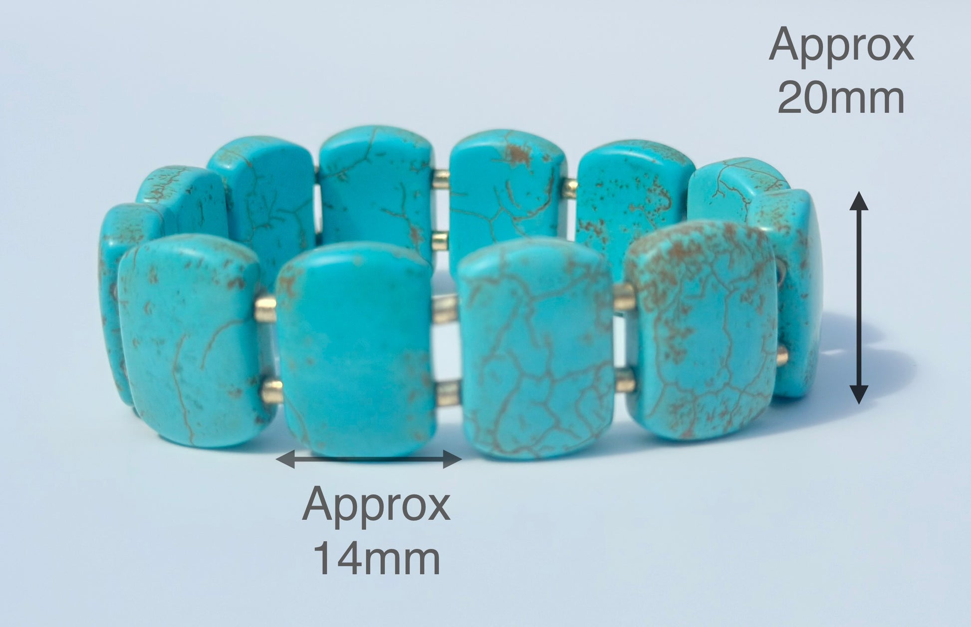 Bonita proudly presents this bold Turquoise gem bracelet designed to awaken memories, stir feelings and inspire lasting sentiment - Wrap your wrist in colour, energy and meaning. Handcrafted in Brazil, this limited edition piece features polished natural turquoise - hued gemstones; Each vibrant blue tone stone carries a unique finish due to its natural veining ( long and winding lines that run through the stone) which certifies the authenticity of the gem. Luxurious 18k gold plated spacers accent each stone, adding warmth, elegance and timeless.
